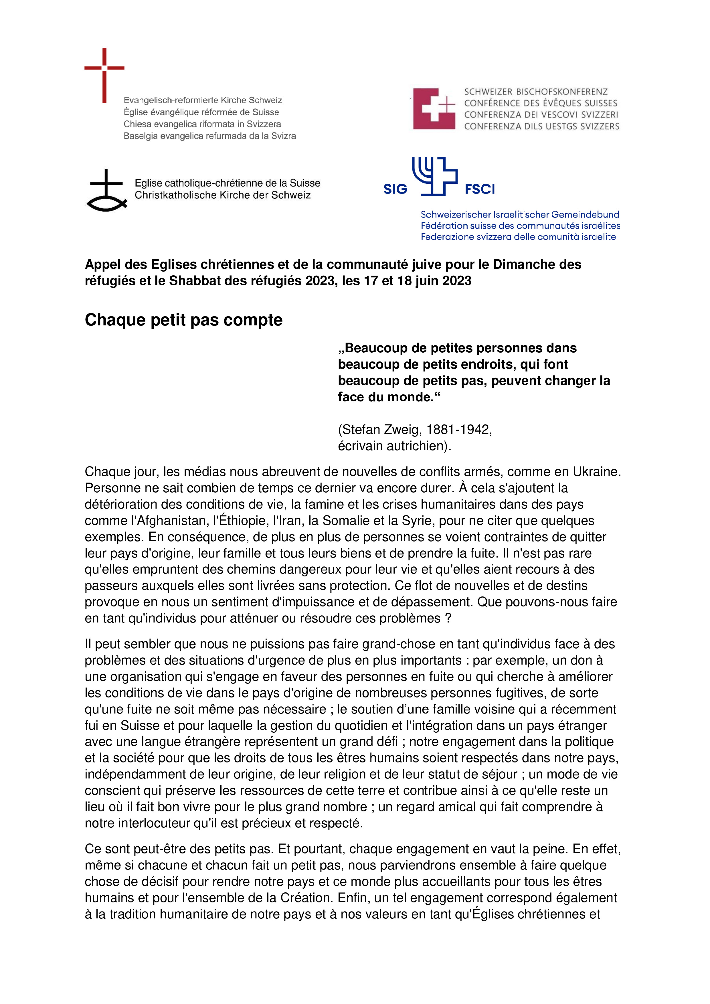 Appel des Eglises chrétiennes et de la communauté juive pour le Dimanche des réfugiés et le Shabbat des réfugiés 2023, les 17 et 18 juin 2023